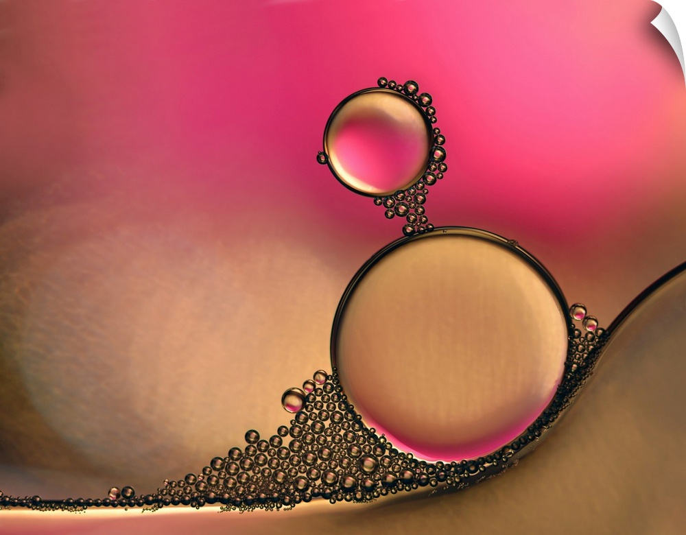 <p>Macro photograph of drops of oil in water with pink and orange hues.</p>