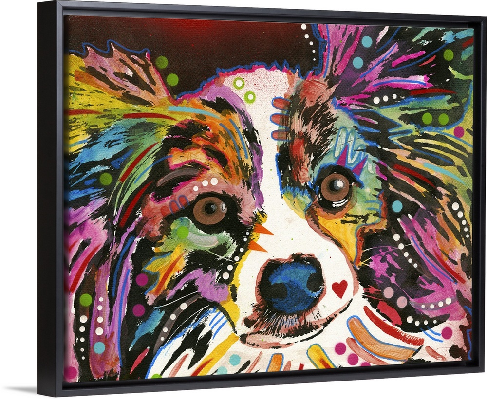 <p>Colorful painting of a Papillon with geometric markings on a deep red and black background.</p>