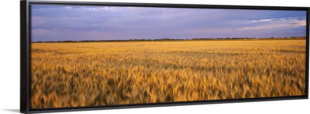 <p>A vast wheat field is photographed in an elongated view under a cloudy sky.</p>