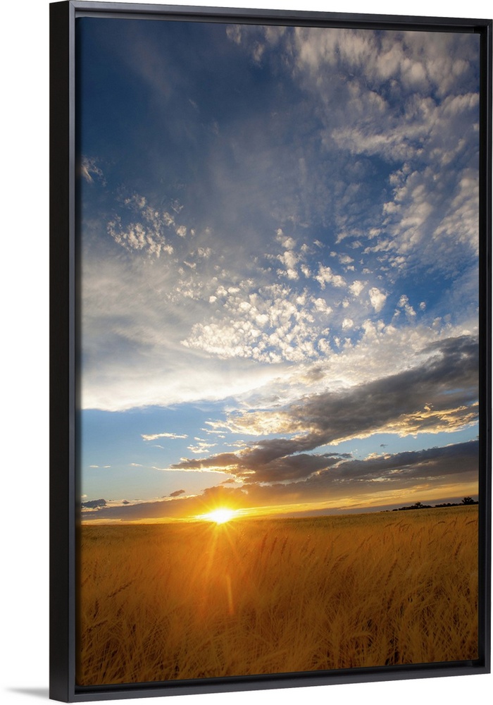 <p>A photograph of a wheat field seen at sunset with dramatic clouds overhead.</p>
