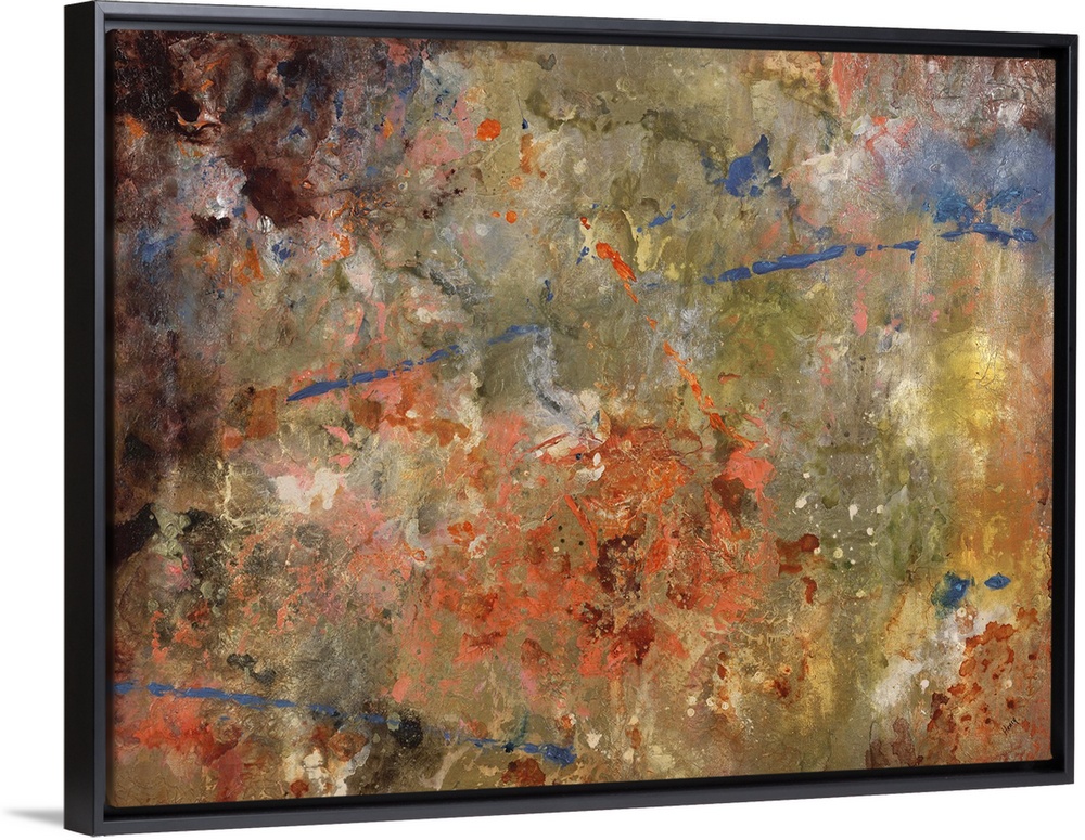 <p>Abstract painting of melding colors in metallic and earth tones that resemble a distant aerial view of a landscape.</p>