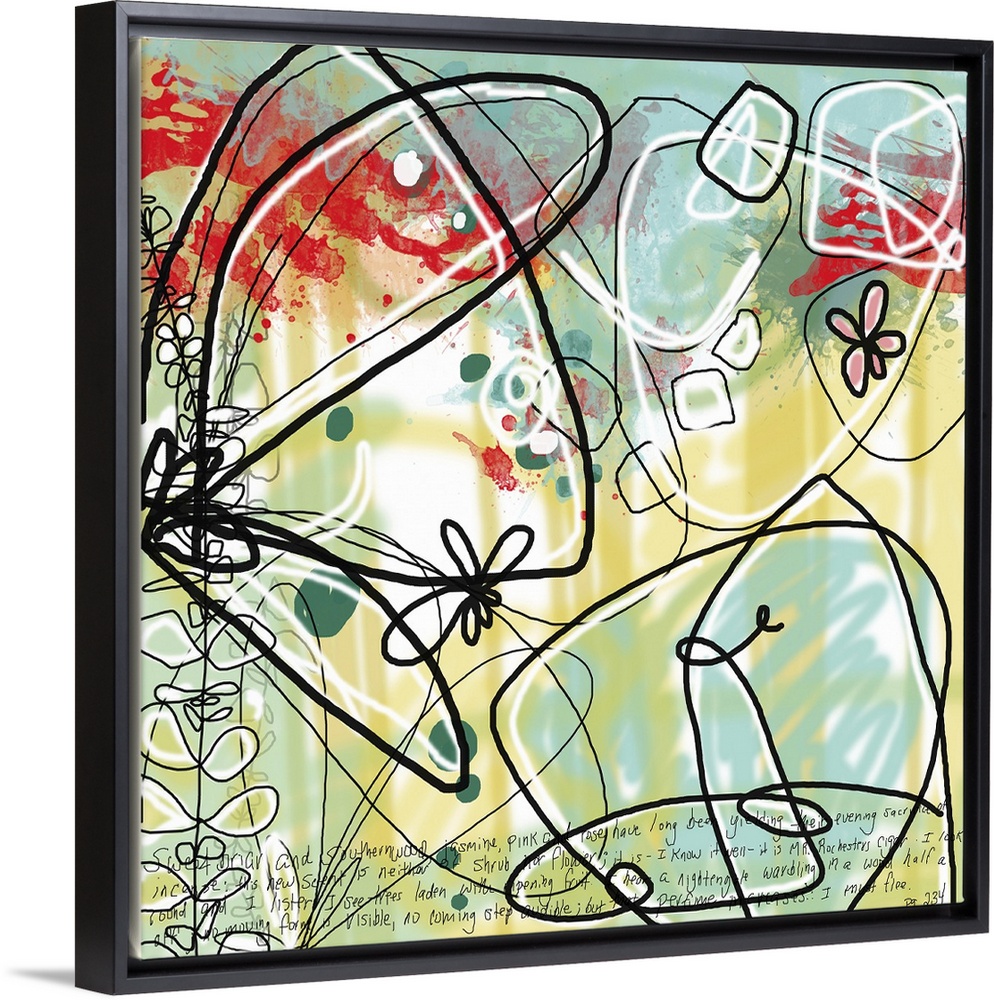 <p>Abstract square painting of outlined scribbles on top of splattered paint and handwriting.</p>
