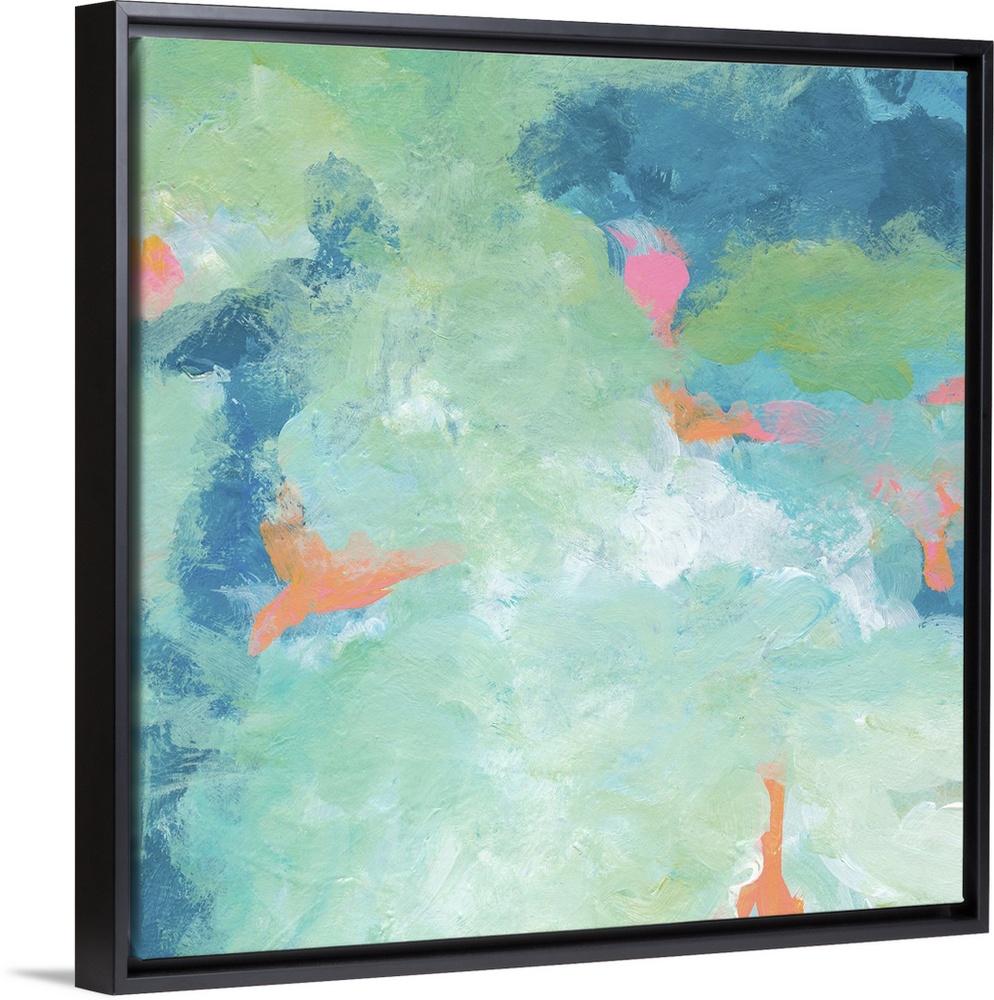 <p>A fresh approach to landscape with fresh crispy colors layered for depth and texture. Sky and land fuse in mixed blue and green while hints of coral peek out from behind.</p>
