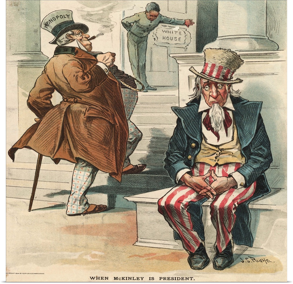 <p>1896 political cartoon showing Uncle Sam shut out of the White House while monopolies march in.</p>