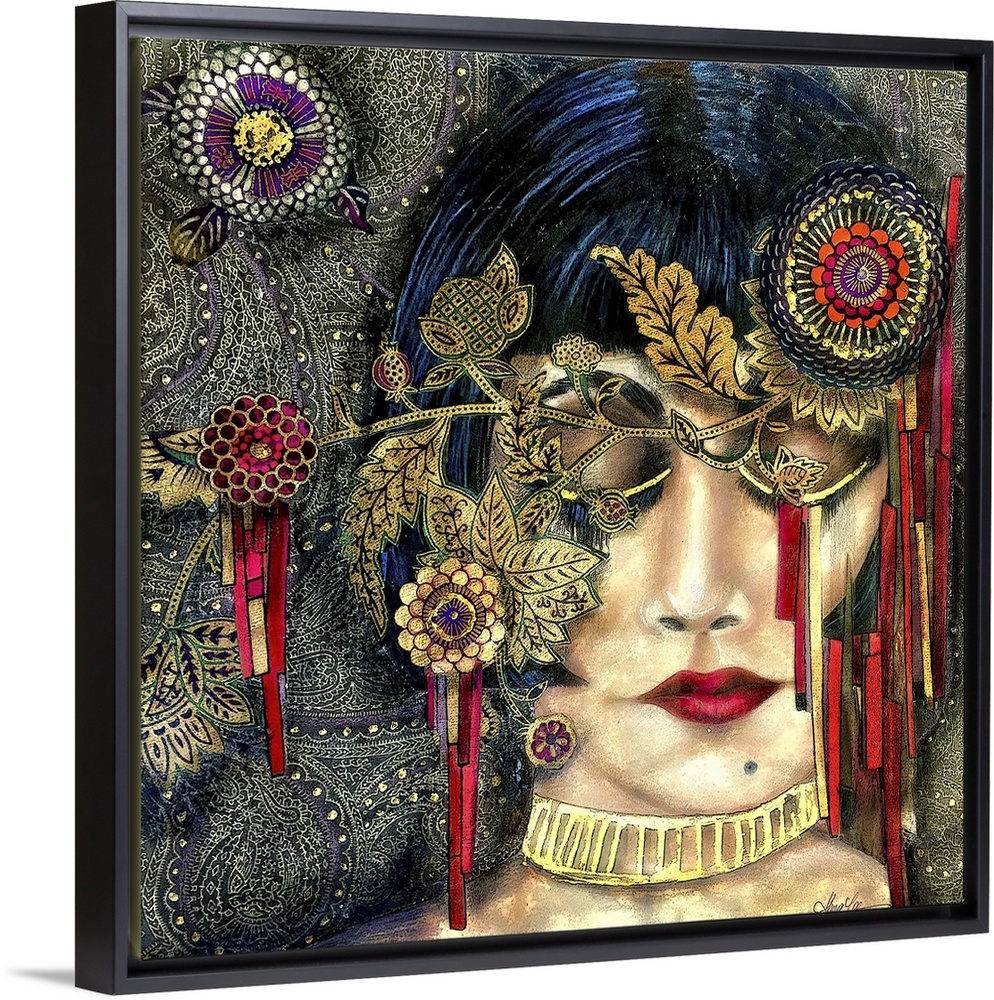<p>A square abstract painting of a female wearing a headdress.</p>