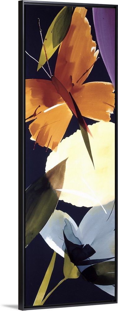 <p>A long vertical painting in a modern design of flowers and leaves on a black backdrop.</p>