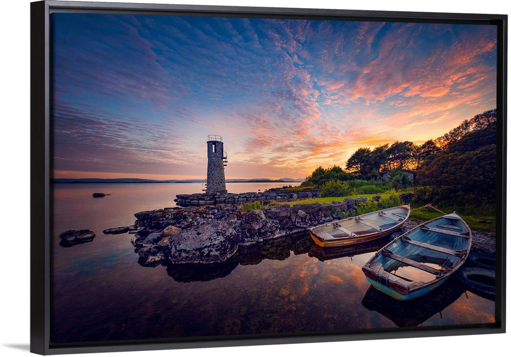 <p>Sunset in Ireland with rowing boats in the foreground around a lighthouse</p>