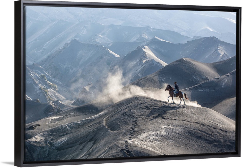 <p>A man on a horse stands on the peak of a large hill in a valley surrounded by dunes.</p>