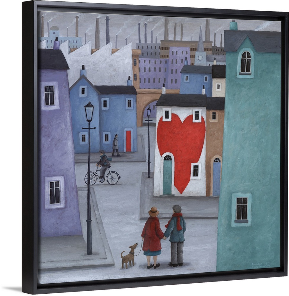 <p>Contemporary painting a couple walking a dog and stopped int he street looking at a house with a giant heart painted on it.</p>