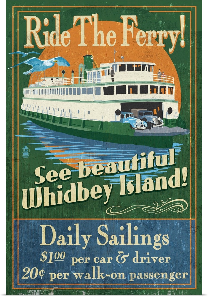<p>Retro stylized art poster of a ferry on the water, with a bird flying beside it.</p>