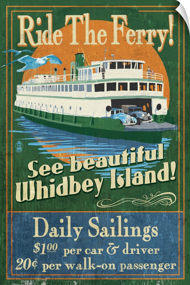 <p>Retro stylized art poster of a ferry on the water, with a bird flying beside it.</p>