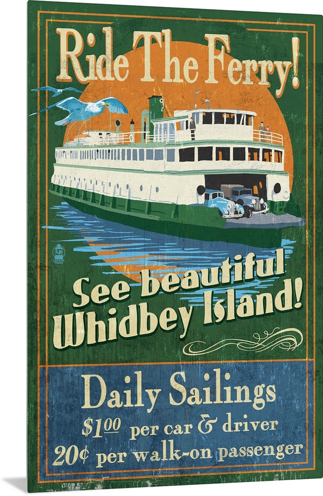 <p>Retro stylized art poster of a ferry on the water, with a bird flying beside it.</p>