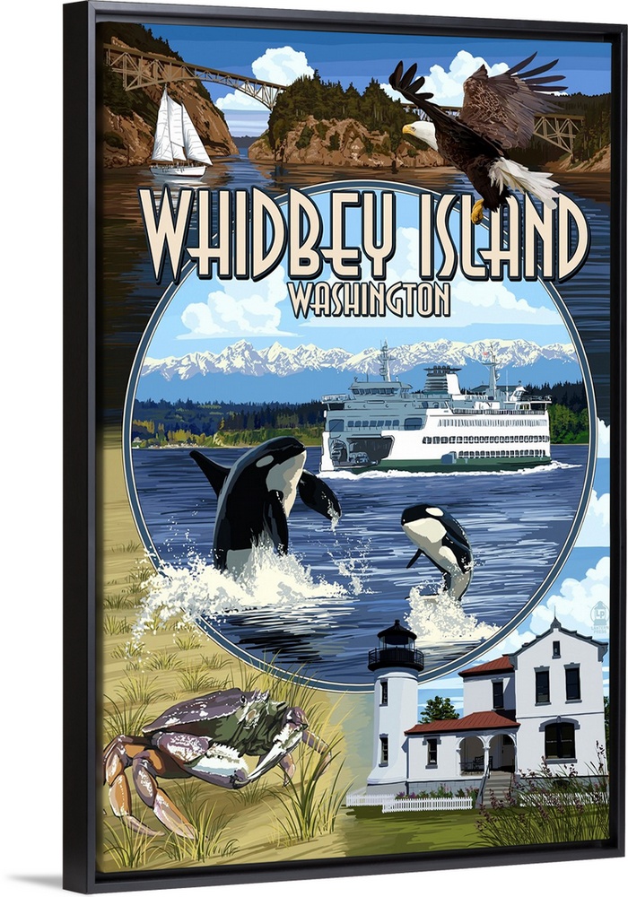 <p>Retro stylized art poster of montage of sights including orca whales, crabs a lighthouse and and eagle in flight.</p>