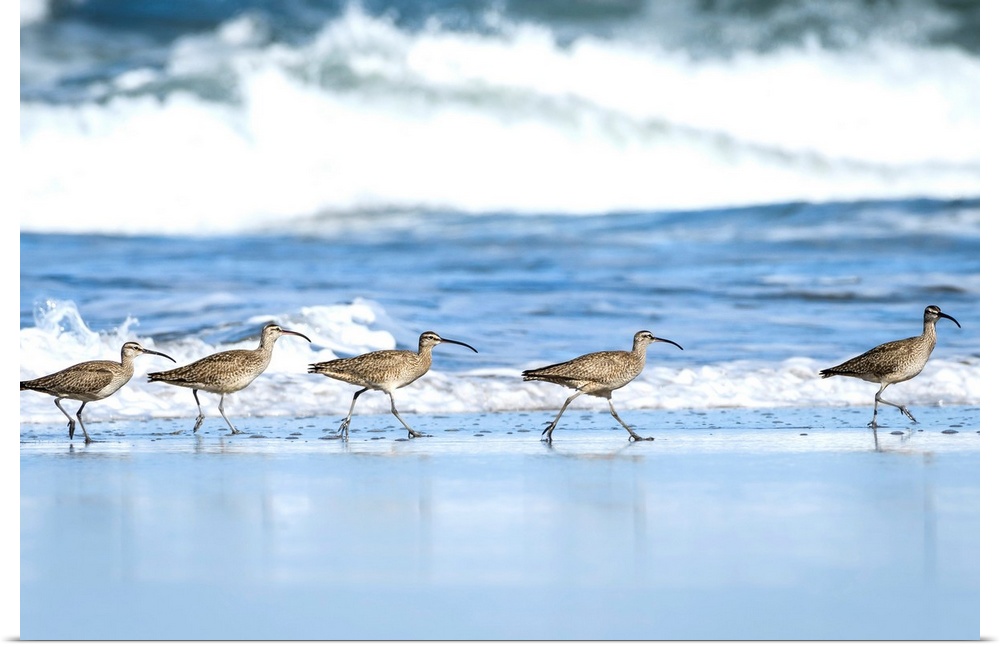 <p>Whimbrels (Numenius phaeopus) look for sand crabs on the beach in Oregon; Newport, Oregon, United States of America</p>