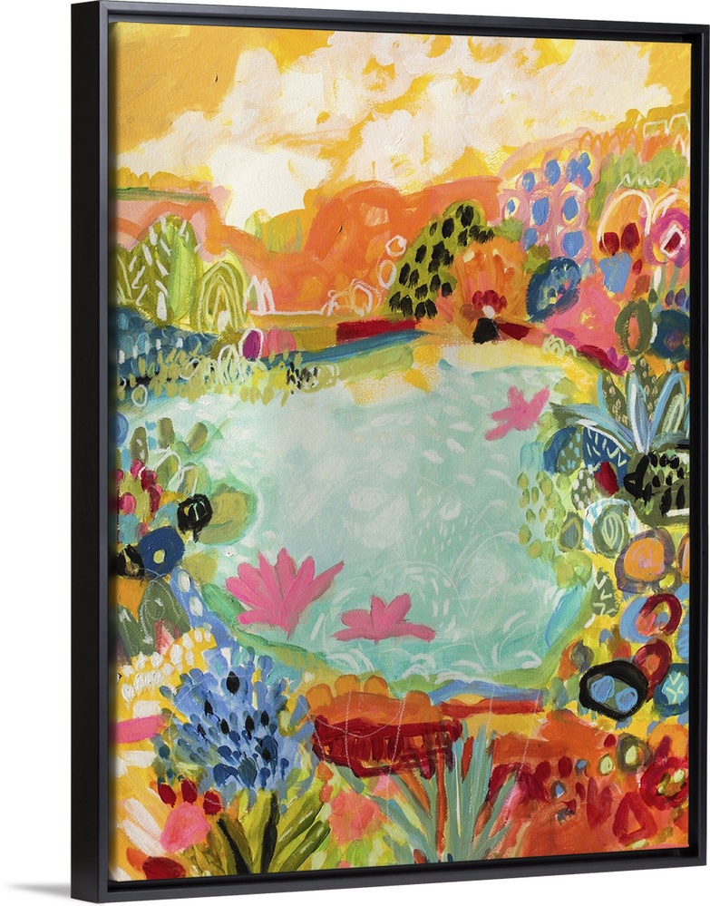 <p>Contemporary artwork of flowers blooming around a tropical pond.</p>