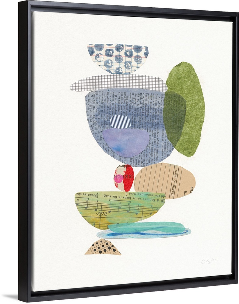 <p>Vertical artwork of varies patterns on curved shapes resembling rocks stacked unto each other.</p>