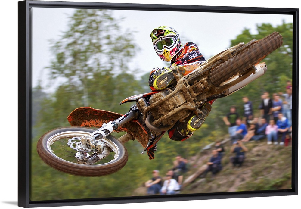 <p>Motocross biker Tony Cairoli jumping his bike as a crowd watches in the background, Maggiora, Italy.</p>