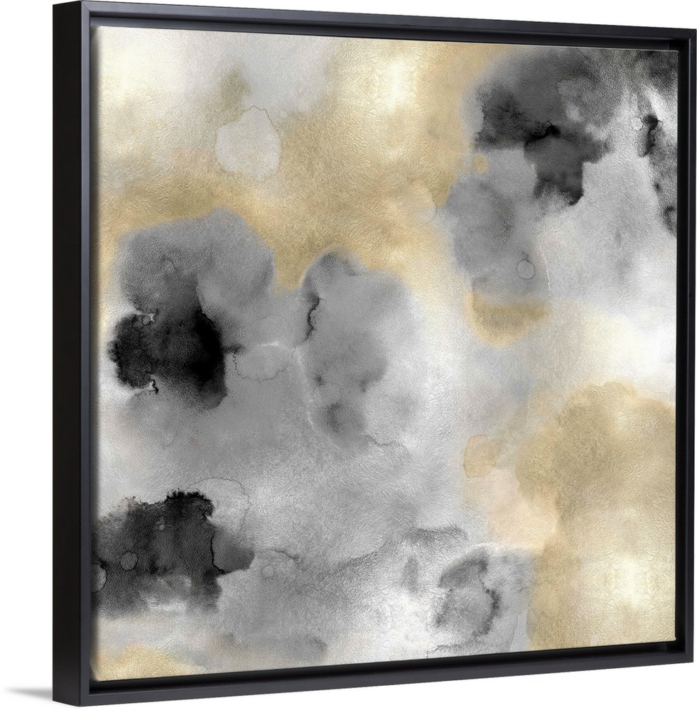 <p>Abstract painting with gold and black hues splattered together on a silver background.</p>