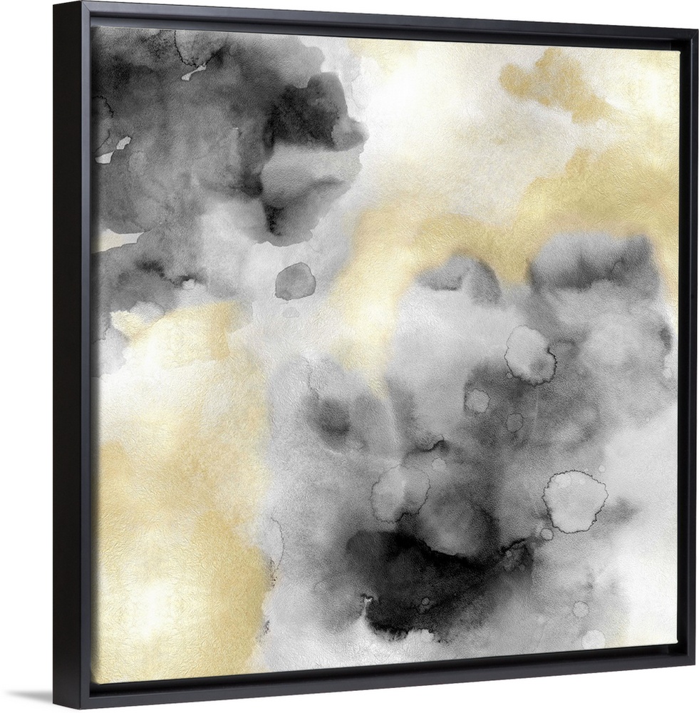 <p>Abstract painting with gold and black hues splattered together on a silver background.</p>