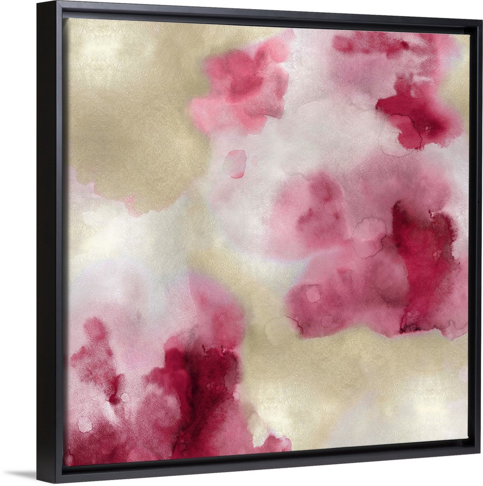 <p>Abstract painting with shades of pink and gold hues splattered together on a silver background.</p>