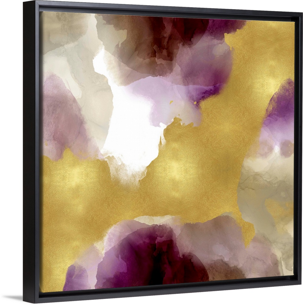 <p>Abstract painting with shades of purple, gray, and gold splattered together on a white background.</p>