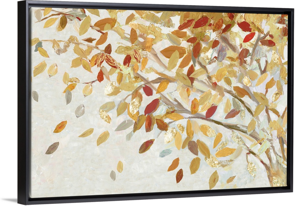<p>A horizontal painting of a branch full of autumn leaves with gold accents.</p>