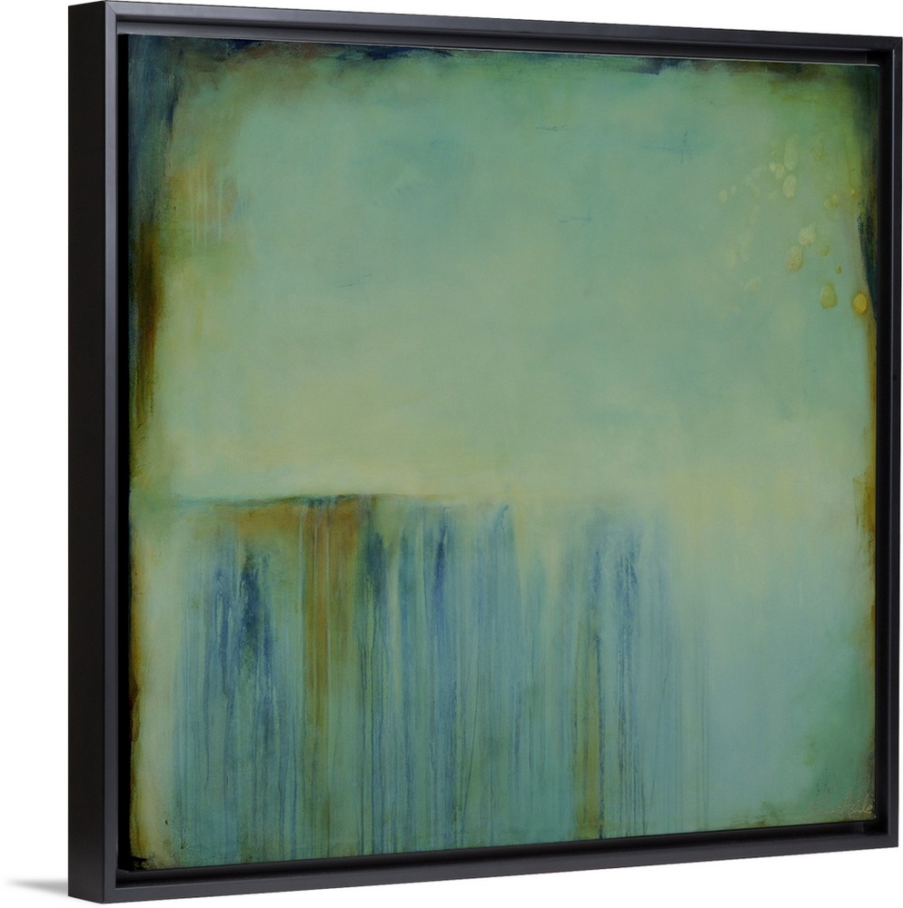 <p>Square abstract painting created with a muted blue turning into green with streaking lines in brown and blue running down to the bottom.</p>