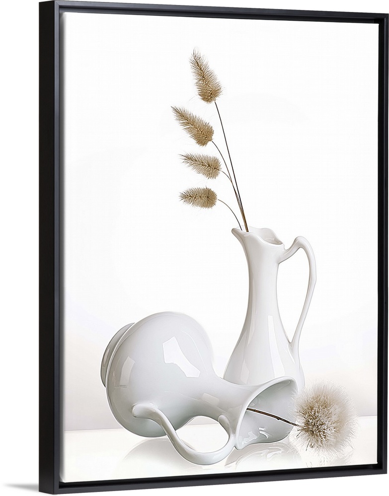 <p>Two white pitchers with puffy flowers on a white background.</p>