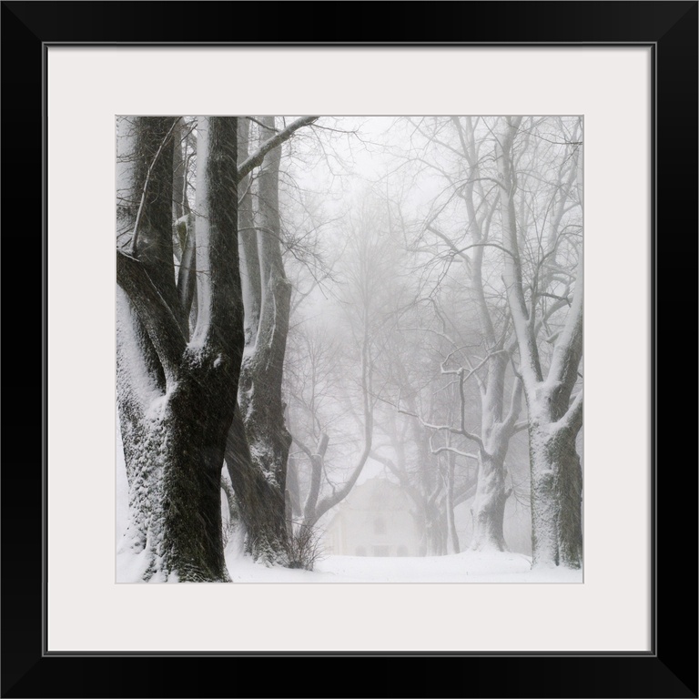 <p>Forest of bare trees in a blizzard so strong, the sides of the trunks are covered in snow.</p>