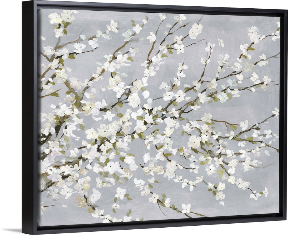 <p>Contemporary painting of white floral blossoms on a gray background.</p>