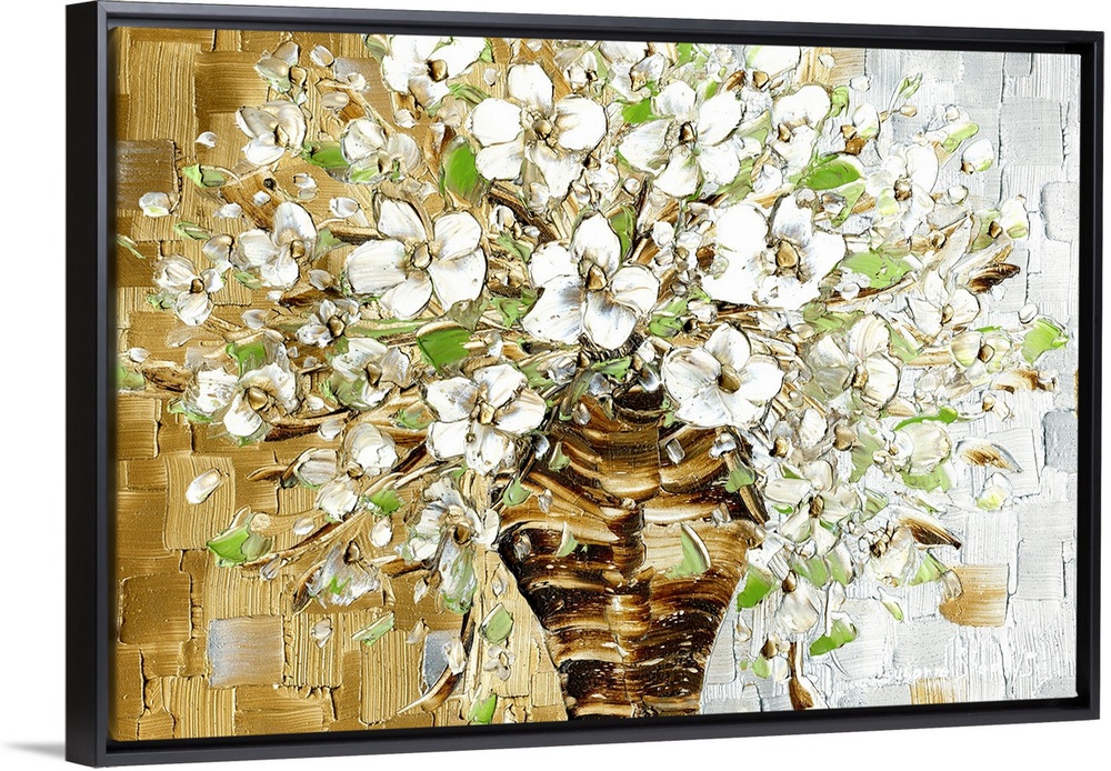 <p>Large contemporary painting of a brown vase with a bouquet of white flowers with light green leaves on a gold and silver background created with layered squares.</p>