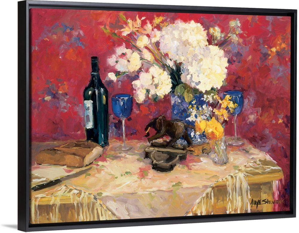 <p>Fine art oil painting still life of wine and bread on table with a vase of white hydrangeas by Allayn Stevens.</p>