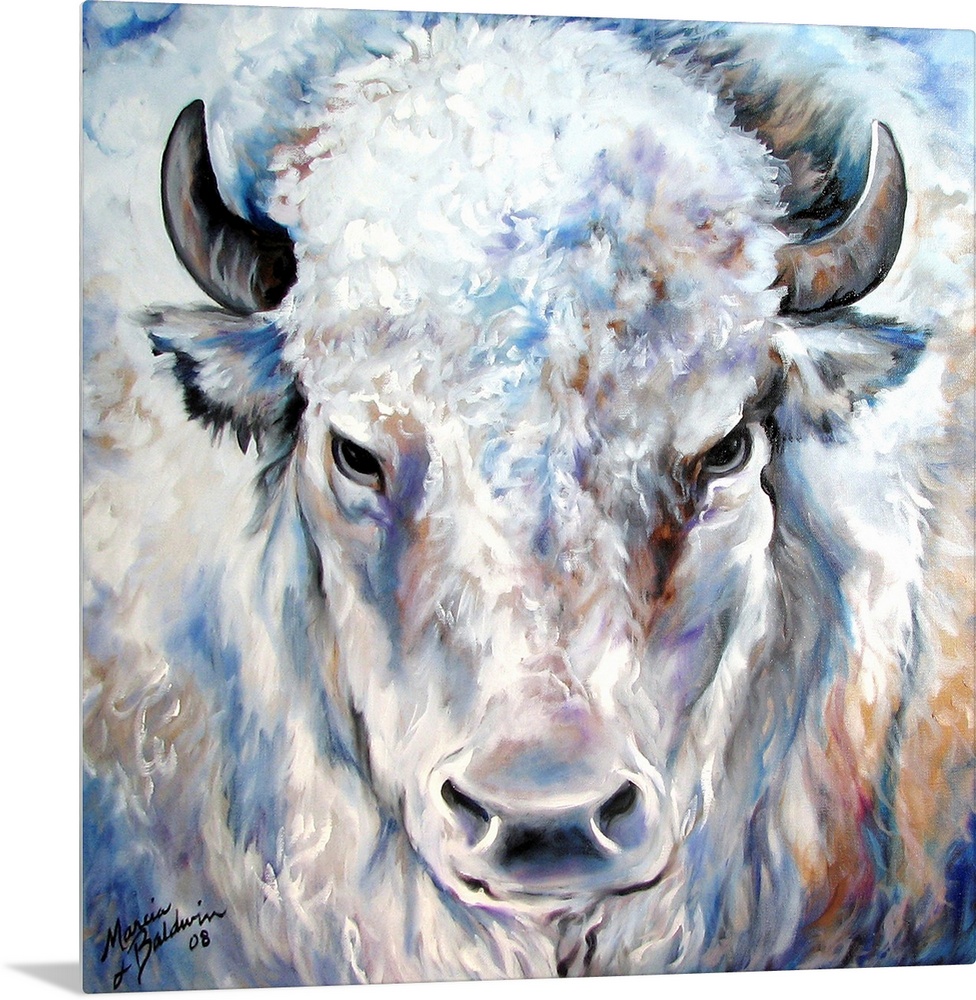 <p>Square painting of a white buffalo created with cool tones and small brushstrokes for texture in the fur.</p>