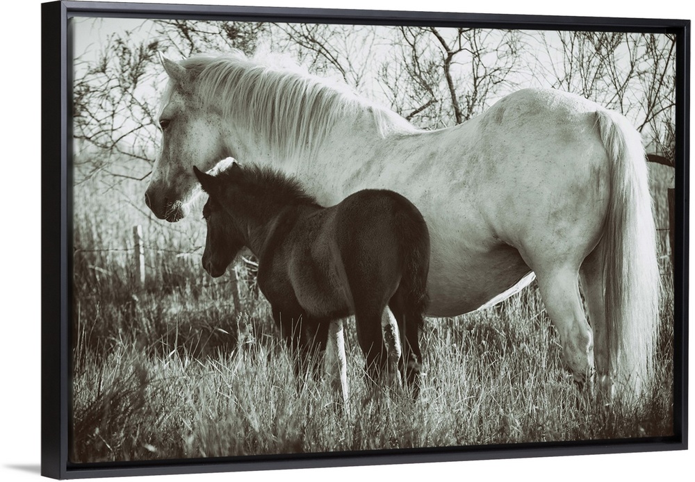 <p>White Camargue horse and baby foal in the south of France</p>