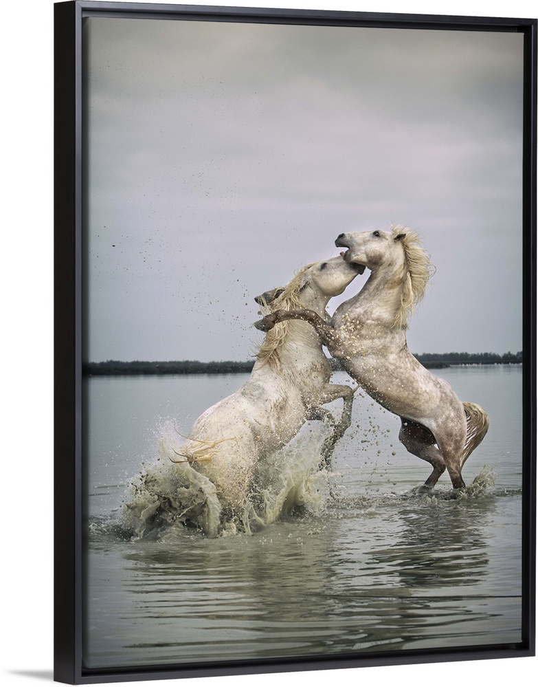<p>White Camargue horse stallions fighting in the water</p>