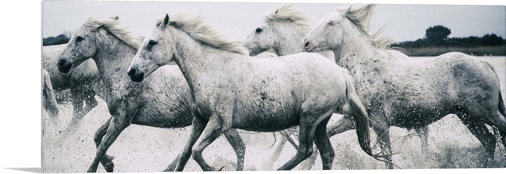 <p>A herd of wild horses running through the ocean on the French coast.</p>