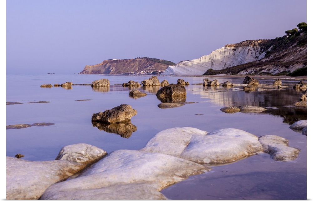 <p>White cliffs known as Scala dei Turchi frame the calm sea at dawn, Porto Empedocle, Province of Agrigento, Sicily, Italy</p>