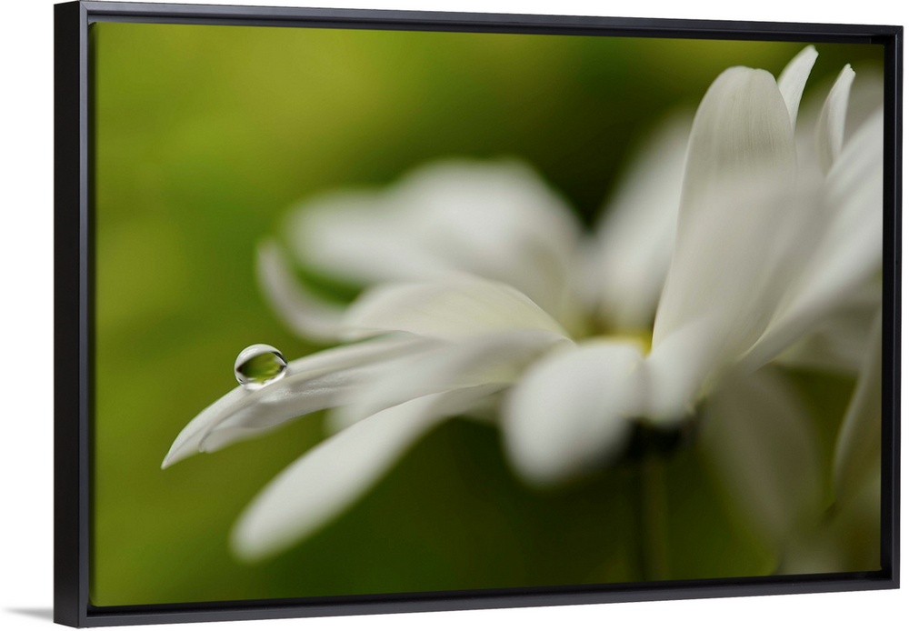 <p>Soft focus macro image of a white flower with a single water droplet on the end of a petal.</p>