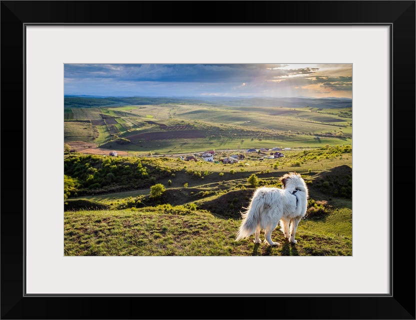 <p>White dog overlooking a small Romanian village in the countryside in summer, Romania, Europe</p>