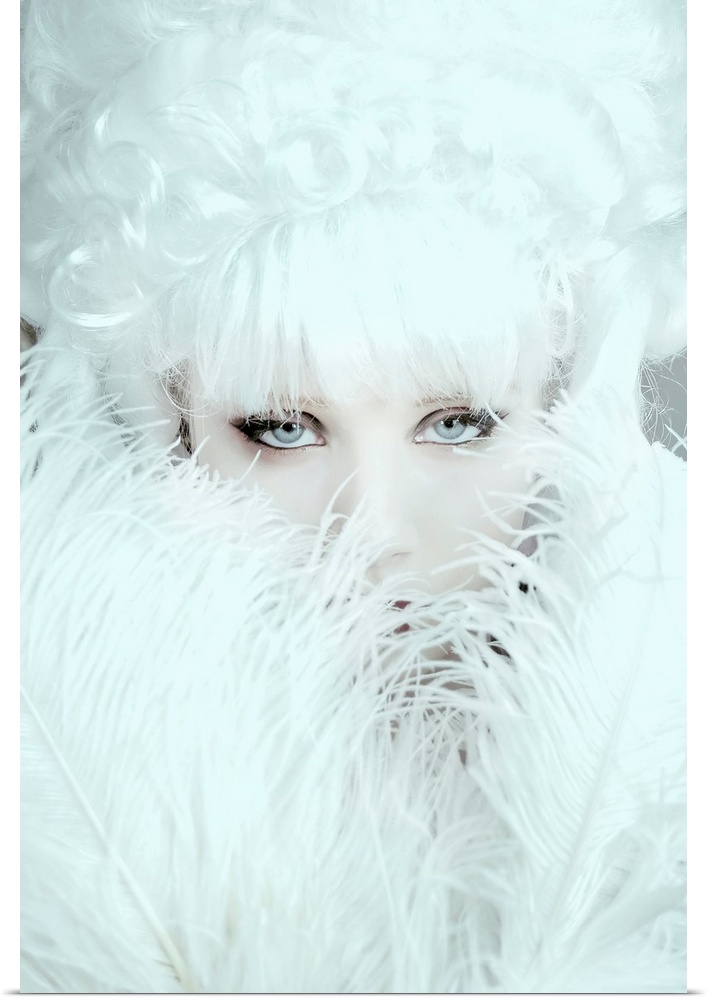 <p>The face of a young woman with blond hair hiding behind feathers</p>
