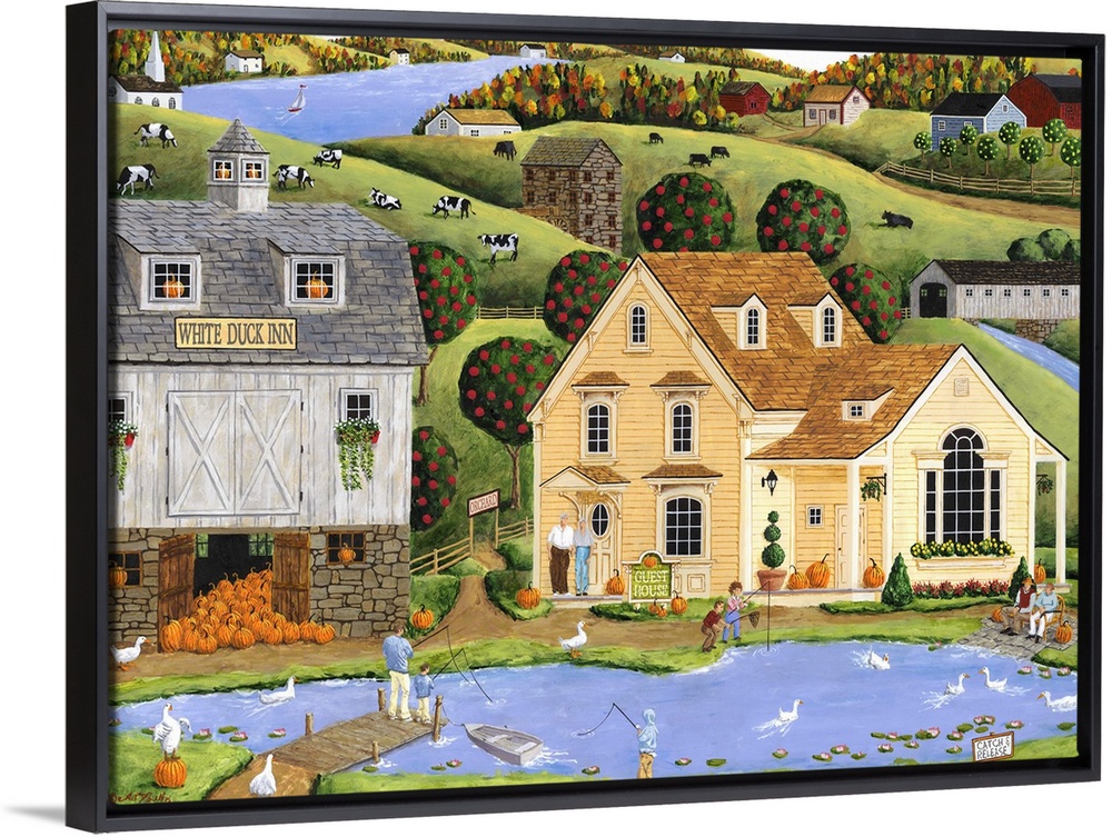 <p>Americana scene of people fishing in a small pond in a village.</p>