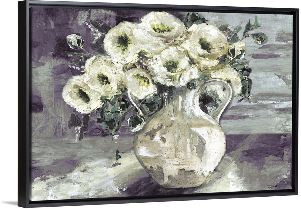 <p>A decorative painting of a pitcher full of white flowers in subdue tones.</p>