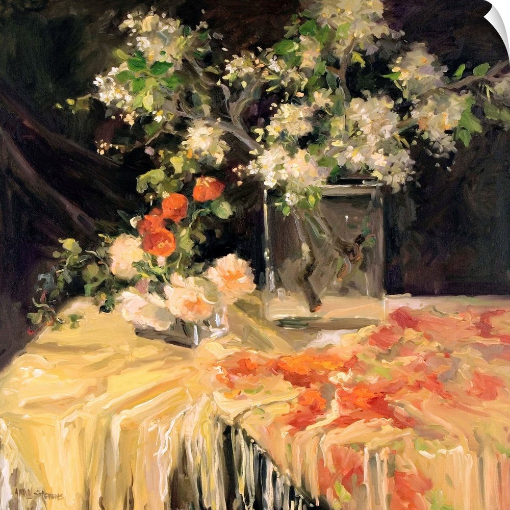 <p>Contemporary still life painting of a beautiful shawl covered table and a vase filled with flowering white freesia.</p>