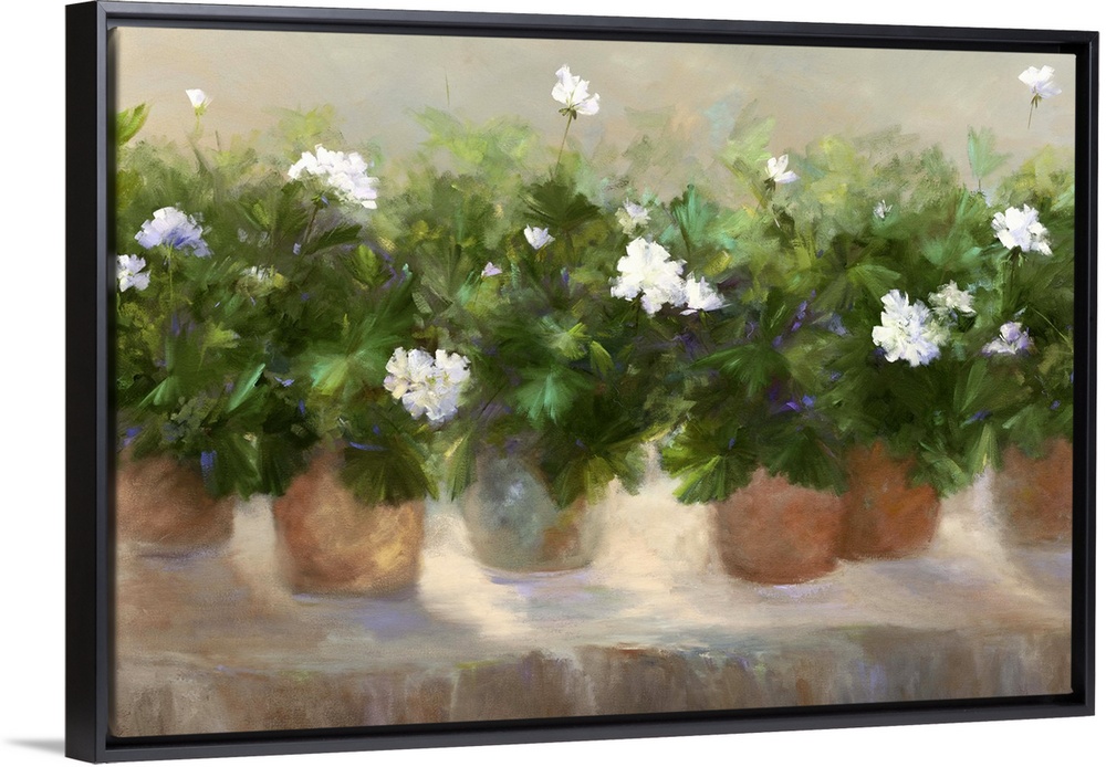 <p>Contemporary painting of a row of clay pots filled with geraniums.</p>