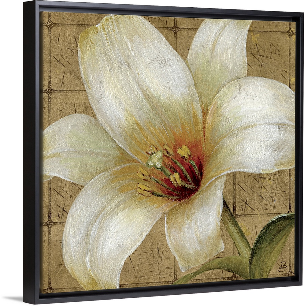 <p>Up-close painting of lily with square stone tile background.</p>