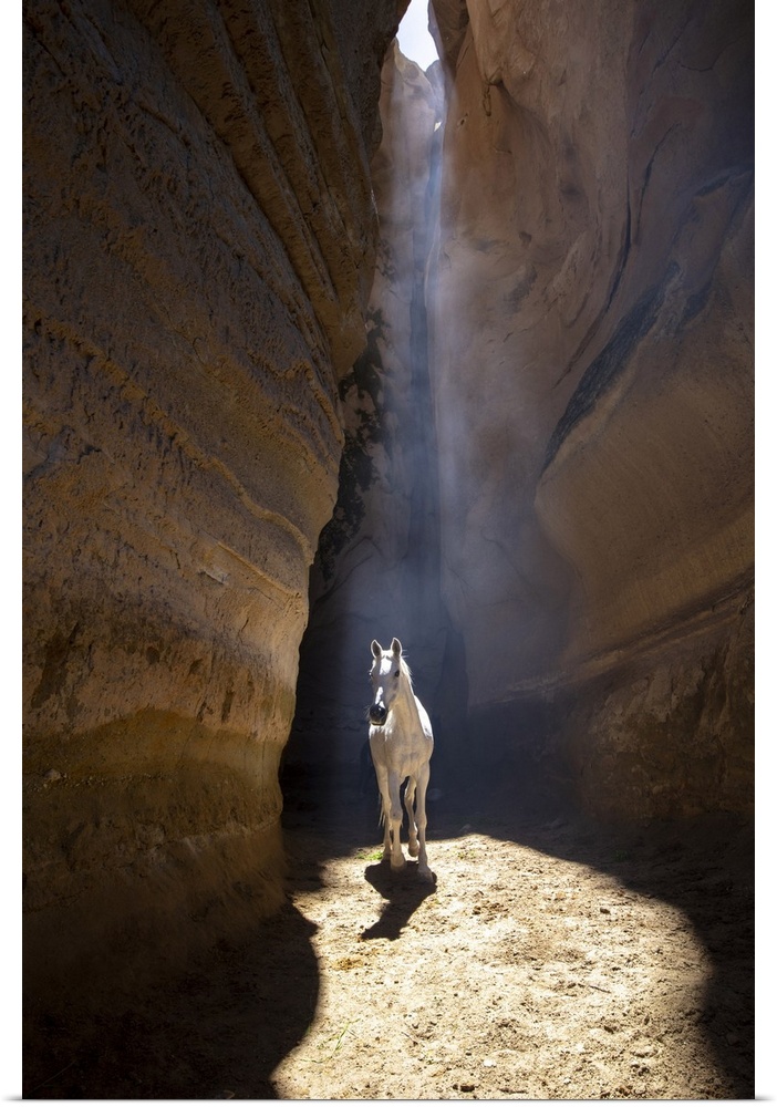 <p>A white horse walks through a slot canyon, Cappadocia, Nevsehir Province, Central Anatolia, Turkey</p>