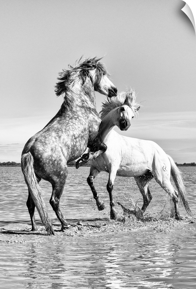 <p>White horses of Camargue fighting in the water, Camargue, France</p>