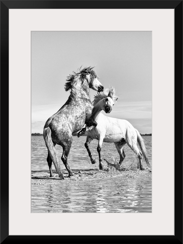 <p>White horses of Camargue fighting in the water, Camargue, France</p>