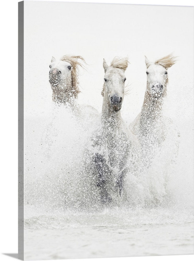 <p>White horses of Camargue running out of the water; Camargue, France</p>