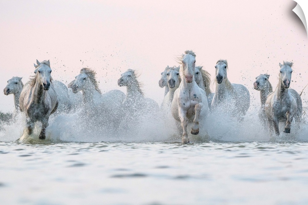 <p>White horses of Camargue running out of the water; Camargue, France</p>